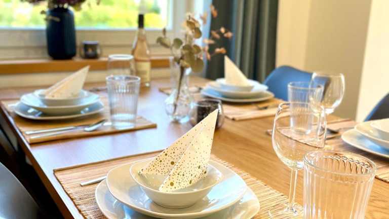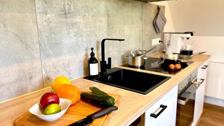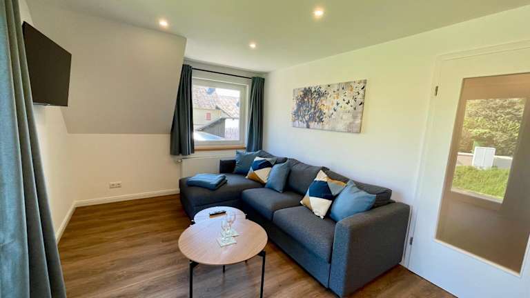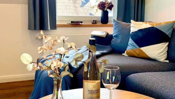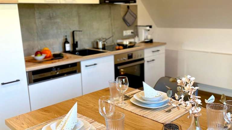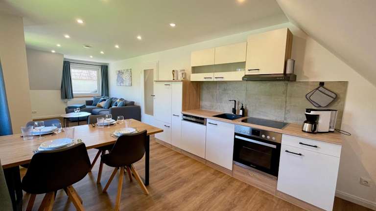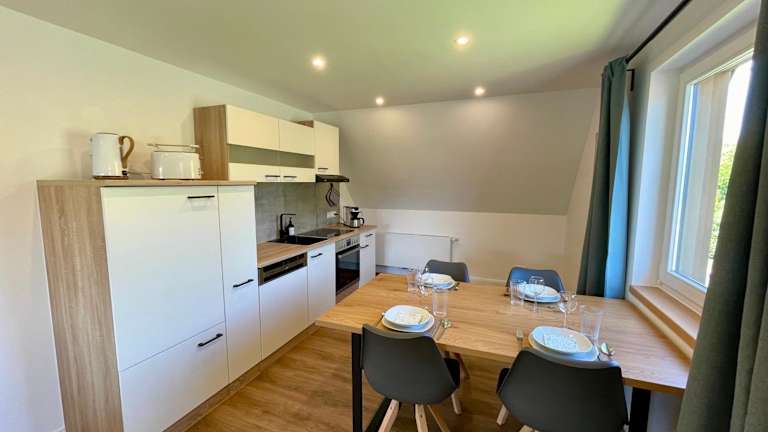 Die Ferienwohnung verfügt über zwei Schlafzimmer, ein Wohnzimmer, einen Flachbild-TV sowie eine gut ausgestattete Küche mit einem Kühlschrank und einem Geschirrspüler. Zur Ausstattung gehört zudem ein Badezimmer mit einer Dusche. Handtücher und Bettwäsche werden bereitgestellt.