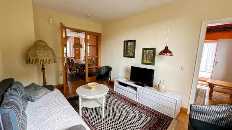 Die Ferienwohnung besteht aus 1 Schlafzimmer, einem Wohnzimmer, einer voll ausgestatteten Küche mit Kühlschrank, einem Essbereich und einem Badezimmer. Zudem gibt es einen TV und einen Balkon.