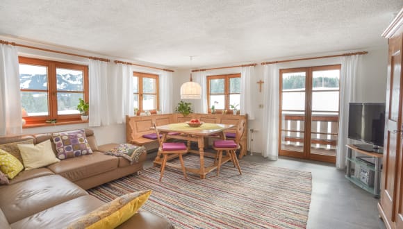 Die komfortable Ferienwohnung ist ebenerdig begehbar, ohne Stufen und Schwellen. Unseren Gästen stehen 130 qm Wohnfläche zur Verfügung. Die im Landhausstil eingerichtete Wohnung bietet ein großzügiges Wohnzimmer mit SAT-TV und Stereoanlage, gemütlicher Sitzecke und einer großen Ledercouch. Die Küche mit Essecke und Spülmaschine, Wasserkocher, Vierplattenherd mit Backofen, Kaffemaschine, Toaster, Mixer etc. ist mehr als zweckmäßig ausgestattet. In dieser Küche mit Bergblick auch das Kochen Spaß. Morgens gibt es keine Staus, da in der Wohnung einmal ein Bad mit kombinierter Dusche, eine Dusche mit WC und ein weiteres separates WC zur Verfügung stehen. Die Schlafzimmer verfügen über einen wohnlichen Holzboden (Lärche) und zusätzlich teilweise eigene Waschbecken. Ein viertes Schlafzimmer mit einer hochwertigen Schlafcouch (durchgehende Matratze) lässt auch die 7. und 8. Person erholsam schlafen. Zwei Reisebettchen und Hochstühle gehören zum Standard. Alle Zimmer verfügen über Berg- und Wiesenblick, Wohnzimmer und die drei Doppelzimmer über Südbalkon bzw. verglaste Loggia.