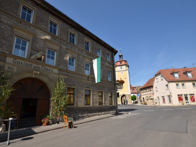 Das Gasthaus "Zum Goldenen Löwen" liegt inmitten der Weinregion Mainfranken im historischen Markgrafenstädtchen Mainbernheim im Landkreis Kitzingen. Mainbernheims Gründung geht auf das Jahr 752 zurück. Die imposante Stadtmauer umgibt die Altstadt des unterfränkischen Mainbernheim als Ringmauer mit Toren, Türmen und Grabenresten. Bis heute haben sich weite Teile der Anlage erhalten, die noch aus der Zeit der Stadterhebung aus dem Beginn des 15. Jahrhunderts stammt. Besonders die wunderschönen Stadtgräben dafür sind inzwischen ein beliebtes Postkartenmotiv. Das Landhotel befindet sich direkt vor dem unteren Turm der Stadt. Die beiden bekannten "Bärleswege" beginnen vor der Haustüre, die Mainbernheim Weinwanderung in unmittelbarer nähe. Jeweils ca. 3 km entfernt finden Sie das Hallen- und Freibad in Kitzingen sowie das Hallenbad in Iphofen. Der Freizeitpark Geiselwind ist ca. 23 km entfernt. Das Freilandmuseum Bad Windsheim sowie die Therme Bad Windsheim sind 27 km entfernt. Die Fahrrad-Highlights Kitzingen (Alte Mainbrücke), Ochsenfurt (alte Fachwerkhäuser), Marktbreit (Malerwinkelhaus) und Dettelbach (Weinstadt) sind über Radwege erreichbar.