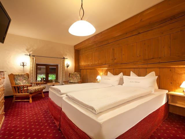 Die meisten der Nichtraucherzimmer im Huberhof verfügen über einen eigenen Balkon oder eine Terrasse. Die Zimmer sind geräumig und im gemütlichen Landhausstil eingerichtet.