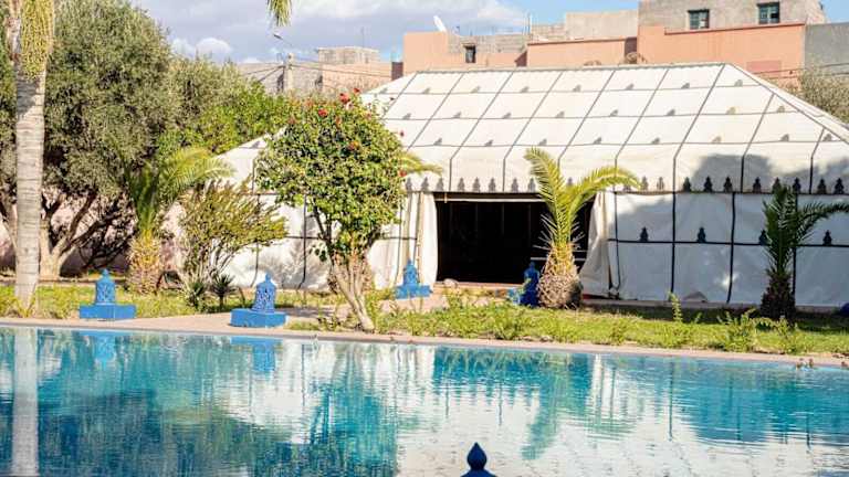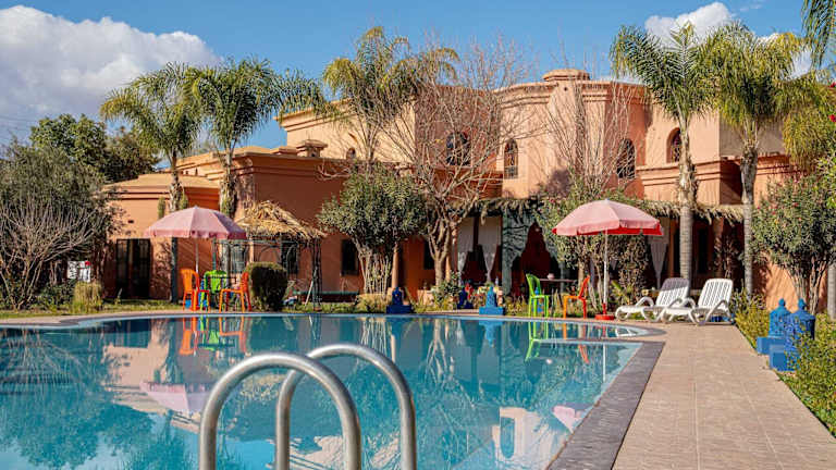 Ruhige Lage außerhalb von Marrakesch. Sehr sehr freundliches Personal. Super Service. 2x Bus vom Hotel in die Stadt und zurück. Swimmingpool sehr sauber, da täglich gereinigt und wenig Chlor im Wasser, da mit Brunnenwasser ständig erneuert. Allein der Pool ist es wert dort Urlaub zu machen. Katzenfreunde haben Ihre Freunde. Alle sehr hilfsbereit. Zimmer sind sehr schön kühl und sehr hohe Räume.
