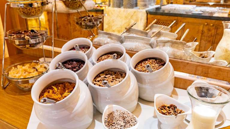 Das Frühstück wird jeden Morgen in Buffetform angeboten und enthält eine Auswahl an kontinentalen und vegetarianen Optionen. Für den kleinen Hunger zwischendurch stehen Snacks wie Znüni und Zvieri zur Verfügung.