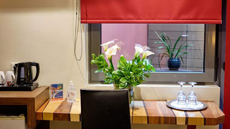 In den klimatisierten Zimmern stehen ein Doppelbett und ein Sofabett zur Verfügung. Zustellbetten können angefordert werden. Die Zimmer bieten einen schönen Meerblick, einen Safe für persönliche Wertgegenstände, eine Tee-/Kaffeemaschine, ein Telefon, Sat-TV sowie Wifi. Jedes Badezimmer ist mit einem Haartrockner und einem weiteren Telefon ausgestattet. Rollstuhlgerechte Zimmer sowie Familien- und Nichtraucherzimmer sind verfügbar.
