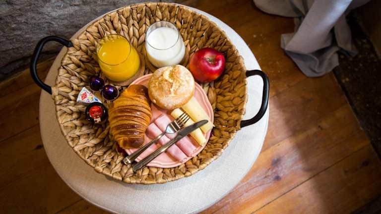 Morgens steht ein Frühstückskorb auf Ihrem Zimmer bereit, der Brot, Croissants, Marmelade, Schinken, Käse und Kaffeekapseln enthält.