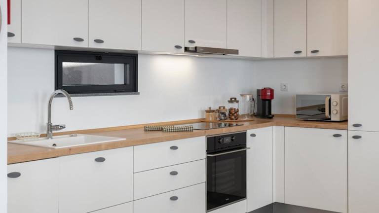 In der voll ausgestatteten Küche stehen ein Kühlschrank und eine Kaffeemaschine zur Verfügung. Keine Informationen zu weiteren Verpflegungsmöglichkeiten vorhanden.