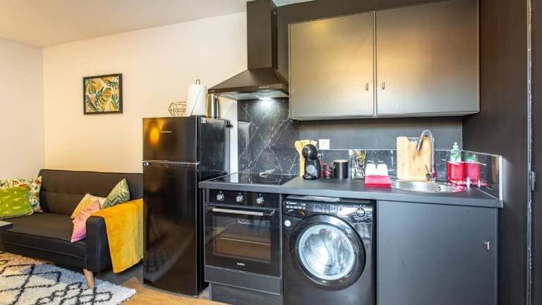 Die Ferienwohnung verfügt über ein Schlafzimmer, ein Wohnzimmer sowie eine gut ausgestattete Küche mit Kühlschrank. Ein Flachbild-TV ergänzt die Einrichtung.