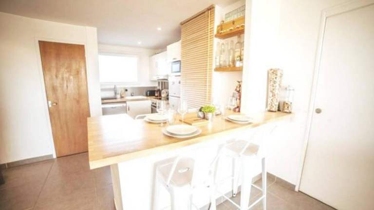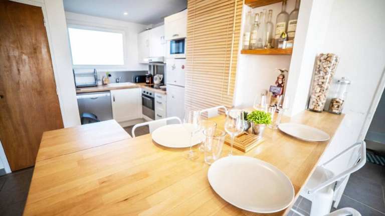 Die Ferienwohnung beinhaltet 2 Schlafzimmer, eine Küche mit Kühlschrank und Geschirrspüler, einen TV, einen Sitzbereich sowie ein Badezimmer mit Dusche.