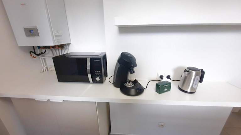 Eine voll ausgestattete Küche ermöglicht die Zubereitung eigener Mahlzeiten. Es stehen Kühlschrank und Kaffeemaschine zur Verfügung, jedoch sind keine spezifischen Verpflegungsmöglichkeiten erwähnt.