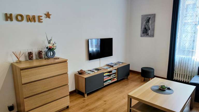 Die Ferienwohnung verfügt über ein Schlafzimmer, ein Wohnzimmer mit Flachbild-TV, eine gut ausgestattete Küche mit Kühlschrank und Geschirrspüler sowie ein Badezimmer mit Badewanne. Handtücher und Bettwäsche werden bereitgestellt, und die Wohnung bietet einen Balkon mit Stadtblick.
