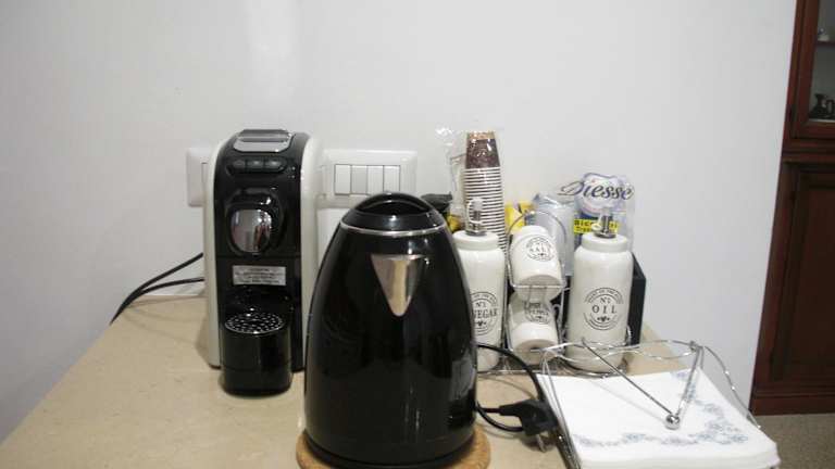 Die Küche der Ferienwohnung ist umfassend ausgestattet mit einem Kühlschrank, einem Geschirrspüler, einem Ofen, einer Kaffeemaschine und einem Wasserkocher, was die Zubereitung von eigenen Mahlzeiten erleichtert.