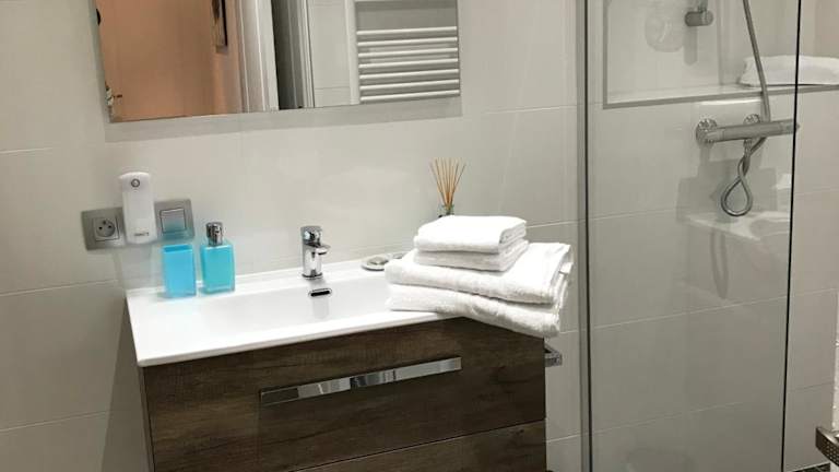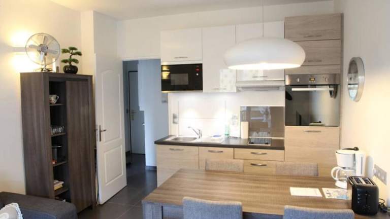 Die Ferienwohnung verfügt über ein Schlafzimmer und ein Badezimmer mit Dusche. Handtücher und Bettwäsche werden bereitgestellt. Die gut ausgestattete Küche ist mit einem Kühlschrank und Geschirrspüler ausgestattet.