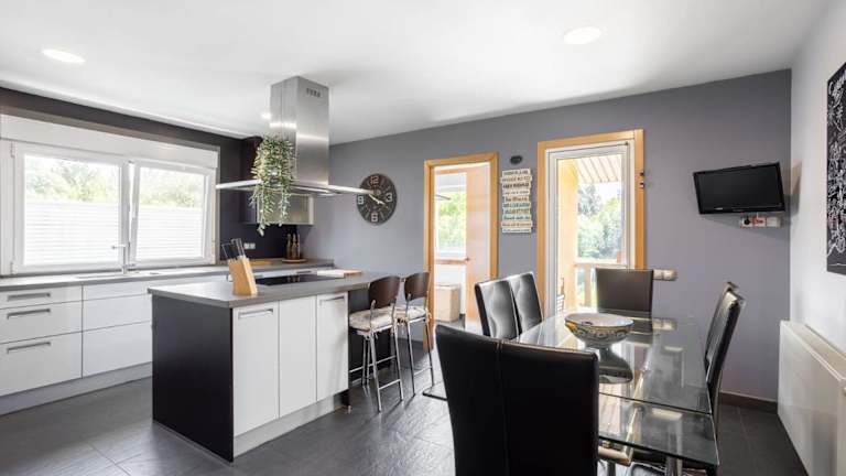 Das Ferienhaus bietet eine geräumige Ausstattung mit 5 Schlafzimmern und 4 Badezimmern. Zur Einrichtung gehören Bettwäsche, Handtücher sowie ein Flachbild-TV mit Kabelkanälen. Die voll ausgestattete Küche lädt zum Kochen ein, während der Essbereich und die Terrasse mit Bergblick eine angenehme Atmosphäre schaffen.