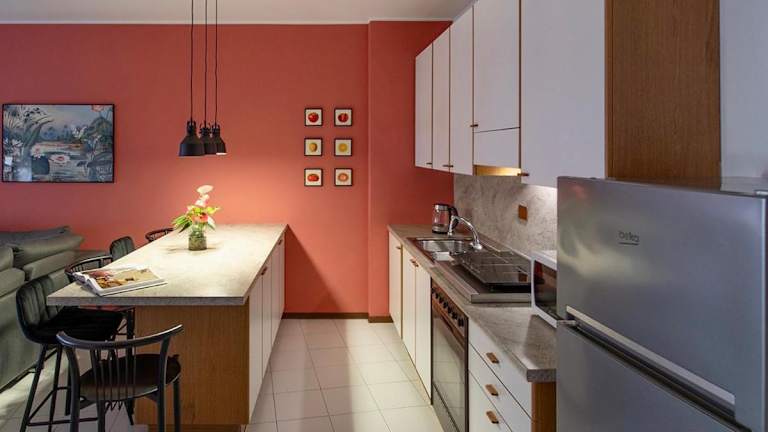 Das Deluxe Apartment besteht aus 1 Schlafzimmer, einem Wohnzimmer und einer voll ausgestatteten Küche mit Kühlschrank und Wasserkocher. Das Badezimmer ist mit einem Bidet und einer Dusche ausgestattet. Handtücher und Bettwäsche werden bereitgestellt.