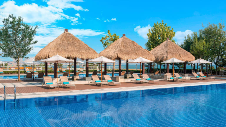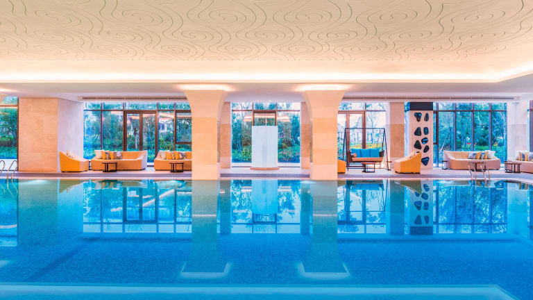 Das Sport- und Freizeitangebot umfasst Innen- und Aussenpools sowie einen Kinderbadebereich. Zudem gibt es Liegestühle auf der Terrasse und einen Whirlpool im Badebereich. Aktivitäten wie Golf, Fitness im Fitnessraum, Aerobic und Wellnessangebote im Spa, inklusive Sauna und Massagen, werden angeboten. Ein Kinderclub sorgt für Betreuung der kleinen Gäste.