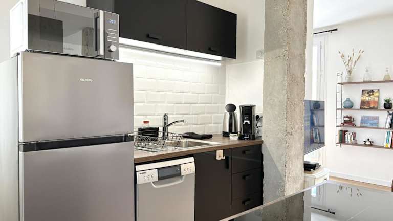 Die Ferienwohnung besteht aus einem Schlafzimmer, einem Wohnzimmer und einer voll ausgestatteten Küche mit Kühlschrank und Kaffeemaschine. Zudem steht ein Badezimmer mit Badewanne oder Dusche und kostenlosen Pflegeprodukten zur Verfügung. Handtücher und Bettwäsche werden bereitgestellt.