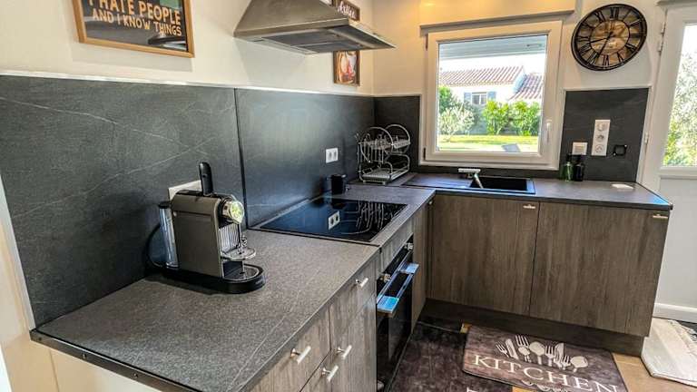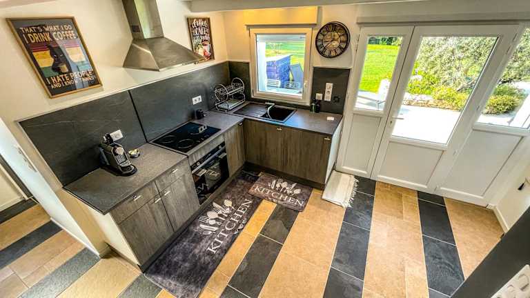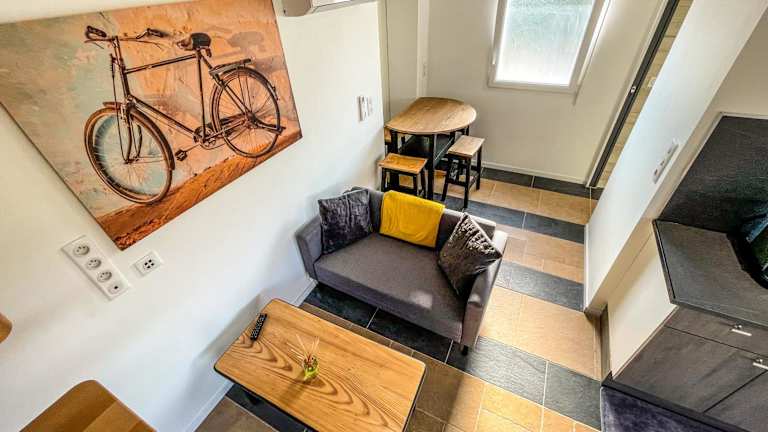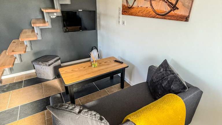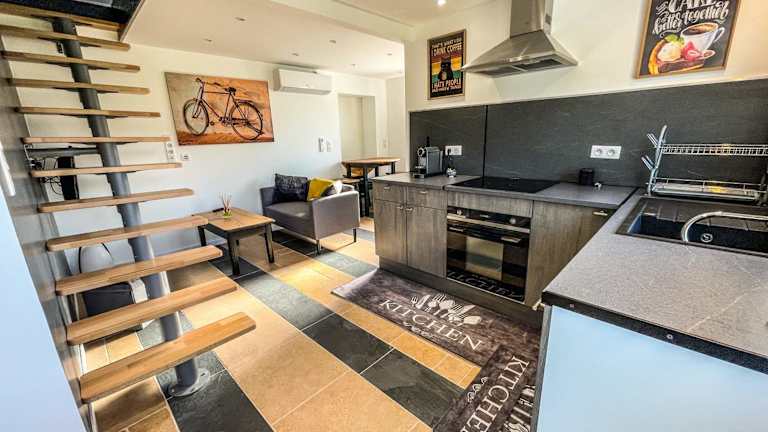 Die Ferienwohnung ist klimatisiert und umfasst ein Schlafzimmer, ein Flachbild-TV, einen Essbereich sowie eine vollständig ausgestattete Küche mit Kühlschrank und Ofen. Handtücher und Bettwäsche werden bereitgestellt.