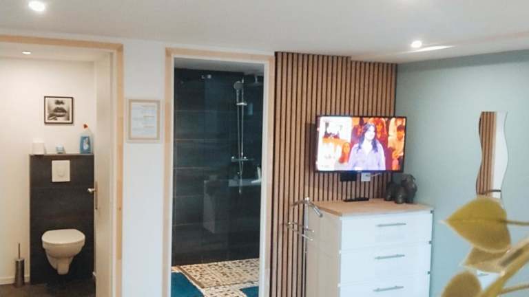 Die Ferienwohnung verfügt über ein Schlafzimmer, ein Wohnzimmer, einen Flachbild-TV und eine gut ausgestattete Küche mit Kühlschrank und Ofen. Ein Badezimmer mit Dusche ist ebenfalls vorhanden. Außerdem lädt eine Terrasse mit Gartenblick zum Verweilen ein.