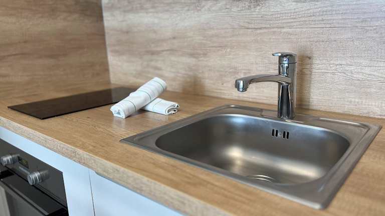 Die Ferienwohnung verfügt über eine voll ausgestattete Küche mit einem Kühlschrank, einer Herdplatte, einem Toaster, einer Kaffeemaschine und einem Wasserkocher, sodass die Gäste ihre eigenen Mahlzeiten zubereiten können. Weitere Verpflegungsmöglichkeiten sind nicht angegeben.