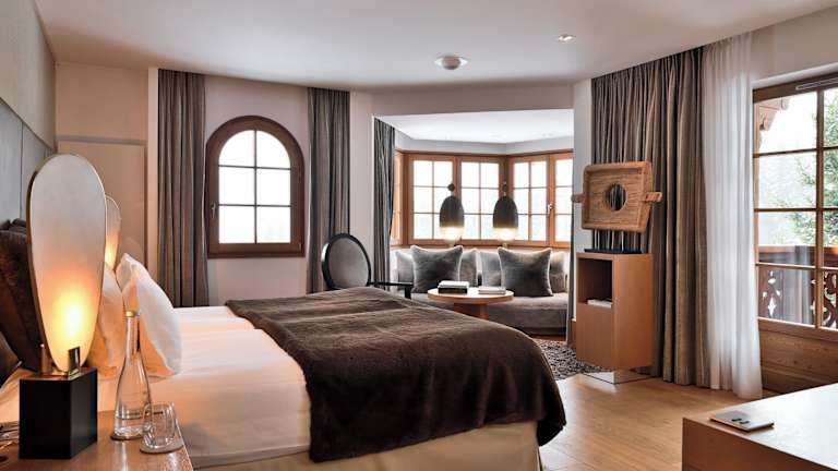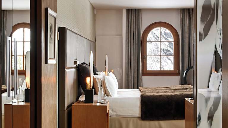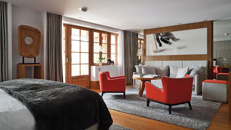 Die stilvollen Zimmer und Suiten im Hotel Le Strato sind modern eingerichtet und mit Parkett ausgelegt. Einige Zimmer verfügen über ein separates Wohnzimmer oder bieten Aussicht auf die Pisten.