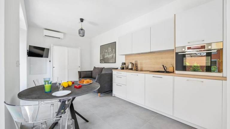Die Unterkunft bietet eine voll ausgestattete Küche mit Kühlschrank, Geschirrspüler und Ofen, ideal für Selbstverpflegung. Keine Informationen zu weiteren Verpflegungsmöglichkeiten vorhanden.