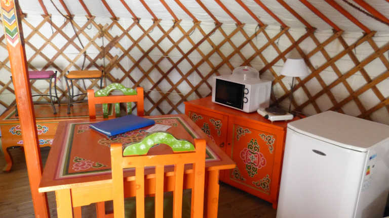 Ein kontinentales Frühstück wird täglich gegen einen Aufpreis angeboten. Die Jurten und Mobilheime sind mit einer Küchenzeile ausgestattet, die Kochutensilien, einen Herd und einen Kühlschrank umfasst. Zusätzliche Annehmlichkeiten wie Mikrowelle, Kaffeemaschine und Wasserkocher stehen ebenfalls zur Verfügung.