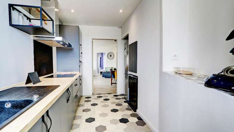 Die Unterkunft bietet gemütliche sowie moderne Einrichtungen und erfüllt mit ihren zwei separaten Schlafzimmern und einem Wohnzimmer einen angenehmen Aufenthalt. Darüber hinaus verfügt sie über eine voll ausgestattete Küche und ein Badezimmer.