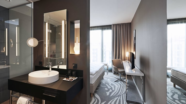 Das moderne Zimmerkonzept mit offenem Wohnbad ist geprägt durch viel natürliches Licht und klare Formen. Die individuell regelbare Klimaanlage sorgt für ein angenehmes Raumklima, die kostenlose Minibar bietet Erfrischung und kostenlose WiFi und DSL-Internetverbindung stellen sicher, dass Sie auch unterwegs immer in Verbindung bleiben. Alle Zimmer sind mit einem gemütlichen Queen- oder King-Size-Bett, Flachbildschirm-TV, Schreibtisch und Sitzgelegenheit sowie Design-Bad mit Dusche, Fön, Kosmetikspiegel und kostenlosen Pflegeprodukten ausgestattet. Die höheren Kategorien bieten mehr Platz, Kaffeemaschine und Tee-Station und Bademantel. Eins der Zimmer ist rollstuhlgerecht und alle Zimmer sind Nichtraucher-Zimmer.