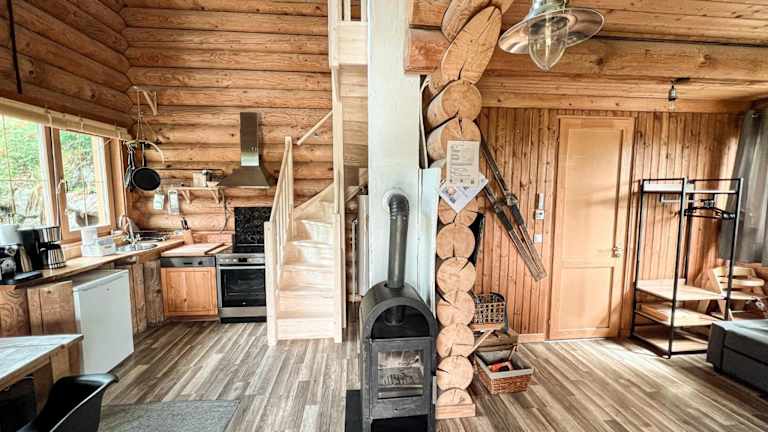 In den Hütten steht den Gästen eine voll ausgestattete Küche zur Verfügung, die einen Kühlschrank, Geschirrspüler, Ofen, Herdplatte, Kaffeemaschine und Wasserkocher beinhaltet.