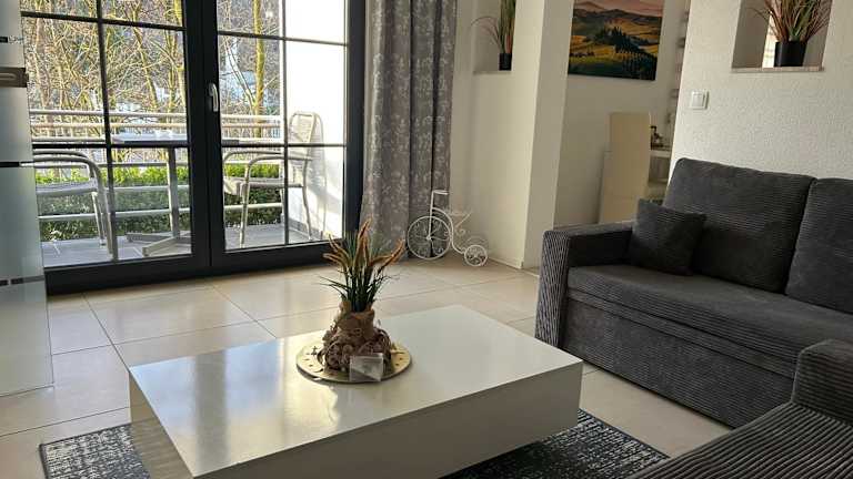 Die Ferienwohnung verfügt über zwei Schlafzimmer, ein Wohnzimmer sowie ein Badezimmer mit Dusche. Zu den Annehmlichkeiten zählen ein Flachbild-TV, eine gut ausgestattete Küche mit Kühlschrank und Ofen. Zudem bietet die Unterkunft einen Balkon und eine Terrasse mit Flussblick. In der Unterkunft werden Handtücher und Bettwäsche zur Verfügung gestellt.