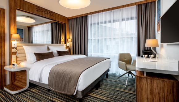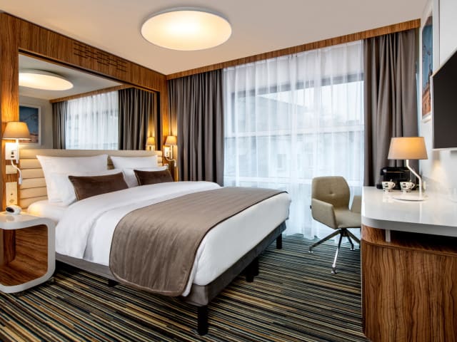 Die klimatisierten Zimmer sind mit Teppichböden ausgestattet und bieten entweder ein Doppelbett, ein Queensize-Bett oder ein Sofabett. Jedes Zimmer verfügt über einen Safe, eine Minibar, einen Schreibtisch, einen Kühlschrank, eine Tee-/Kaffeemaschine, einen Fernseher sowie ein modernes Bad mit Dusche und Badewanne. Kosmetikartikel und eine Auswahl an Handtüchern werden bereitgestellt. Auch rollstuhlgerechte Zimmer mit barrierefreiem Bad sind verfügbar.