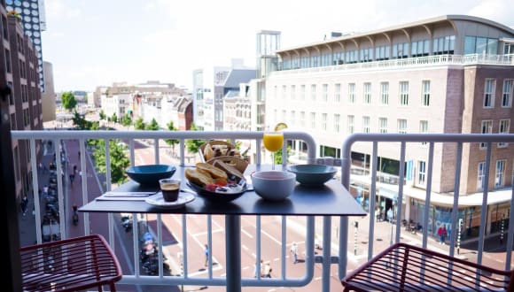 Ein guter Start in den Tag ist sehr wichtig, deshalb möchten Sie gerne ein reichhaltiges Frühstück zu sich nehmen, oder? Im Leonardo Hotel Utrecht City Center können Sie aus einer Vielzahl von Frühstücksoptionen wählen. Sie können sich auch in der Coffee Lounge des Leonardo Hotel Utrecht City Center entspannen, die 24 Stunden am Tag, sieben Tage die Woche zur Verfügung steht. Informationen zum Restaurant Sie frühstücken morgens in unserem Frühstücksrestaurant. Wir verstehen, dass Sie während Ihres Aufenthalts so viel wie möglich von der Stadt entdecken möchten. Die schönsten Bars und die besten Restaurants sind von unserem Hotel im Stadtzentrum zu Fuß erreichbar. Speisen Sie zum Beispiel in einem der Restaurants an der stimmungsvollen Oudegracht. Wollen Sie die besten Tipps von lokalen Kennern? Unsere Mitarbeiter werden Ihnen gerne ihren eigenen Favoriten nennen. Informationen zur Lounge Sie sind nach einer langen Sitzung ins Hotel zurückgekehrt. Vielleicht wollen Sie aber auch schon früh zu einem Stadtbummel aufbrechen oder Sie kommen nach einem langen Flug spät im Hotel an. In jeder dieser Situationen ist es gut, wenn Sie sich in unserer Coffee Lounge in der gemütlichen Atmosphäre Ihres eigenen Wohnzimmers entspannen können. Hier können Sie 24 Stunden am Tag, sieben Tage die Woche eine Tasse Kaffee oder Tee trinken. Wenn Sie noch etwas arbeiten müssen, können Sie unser kostenloses Wi-Fi nutzen. Gleich neben der Lounge befindet sich unser Hotelrestaurant, in dem Sie sowohl mittags als auch abends essen können und von dem aus Sie einen herrlichen Blick auf das Stadtzentrum von Utrecht haben.