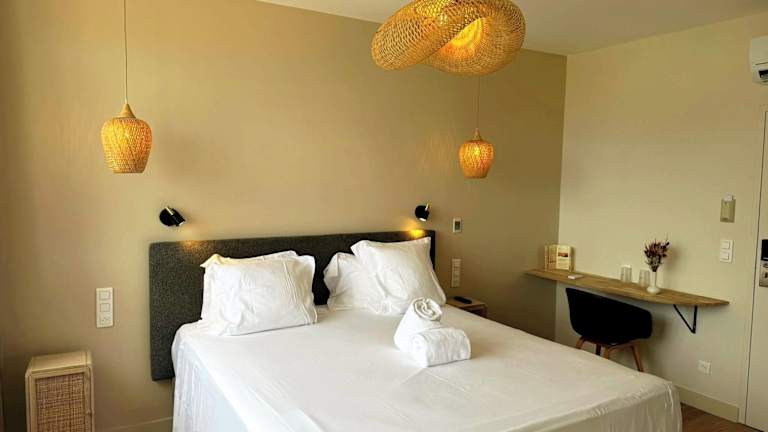 Die Zimmer sind mit Klimaanlage und Heizung ausgestattet. Die meisten Zimmer verfügen über einen Balkon mit Meerblick. Zur Ausstattung gehören ein Doppelbett, ein Queensize-Bett oder ein Sofabett, ein Safe, ein TV-Gerät und gratis WiFi. Die Badezimmer sind mit Dusche und Badewanne ausgestattet, zusätzlich gibt es einen Haartrockner und ein Telefon. Es stehen Familien- und Nichtraucherzimmer zur Verfügung.