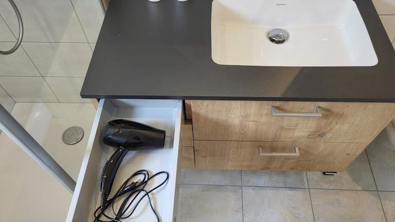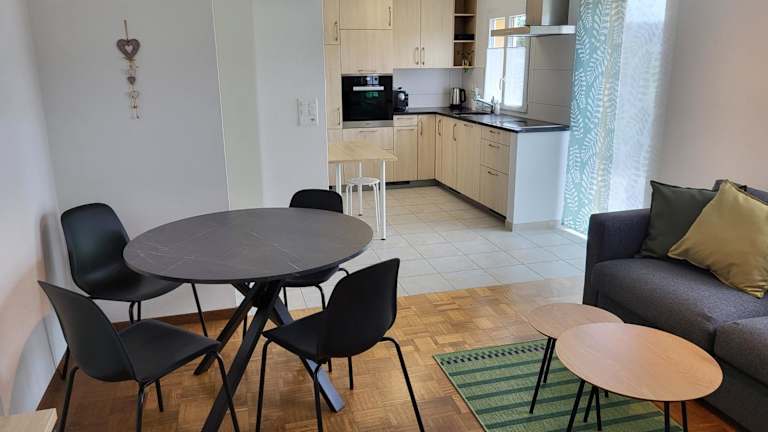 Die Ferienwohnung umfasst ein Schlafzimmer, ein Wohnzimmer und ein Badezimmer mit Dusche. Die gut ausgestattete Küche ist mit einem Kühlschrank und einem Geschirrspüler eingerichtet. Handtücher und Bettwäsche werden ebenfalls bereitgestellt.