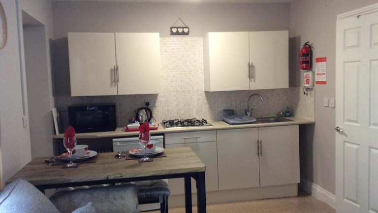 Die Wohnung beinhaltet ein Schlafzimmer und ist mit einer Küche ausgestattet, die über einen Kühlschrank und einen Ofen verfügt. Des Weiteren gibt es einen Flachbild-TV, einen Sitzbereich und ein Badezimmer mit Dusche. Handtücher und Bettwäsche sind ebenfalls vorhanden.