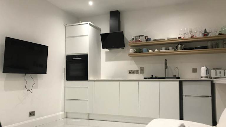 Die Ferienwohnung verfügt über ein Schlafzimmer, ein Wohnzimmer mit Flachbild-TV und Kabelkanälen sowie eine voll ausgestattete Küche mit Kühlschrank und Ofen. Ein Badezimmer mit Dusche ist ebenfalls vorhanden. Handtücher und Bettwäsche werden bereitgestellt. Das gesamte Appartement ist Nichtraucherbereich.