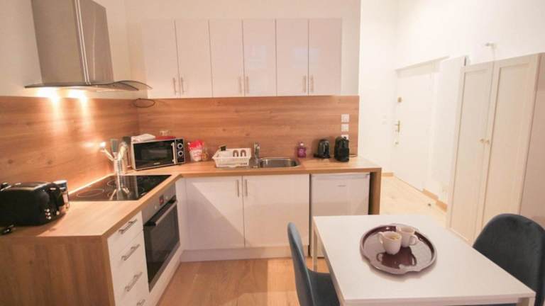Die Küche ist ausgestattet mit einem Kühlschrank, einem Ofen, einer Mikrowelle, einer Kaffeemaschine und einem Wasserkocher, sodass Gäste die Möglichkeit haben, sich eigene Mahlzeiten zuzubereiten.