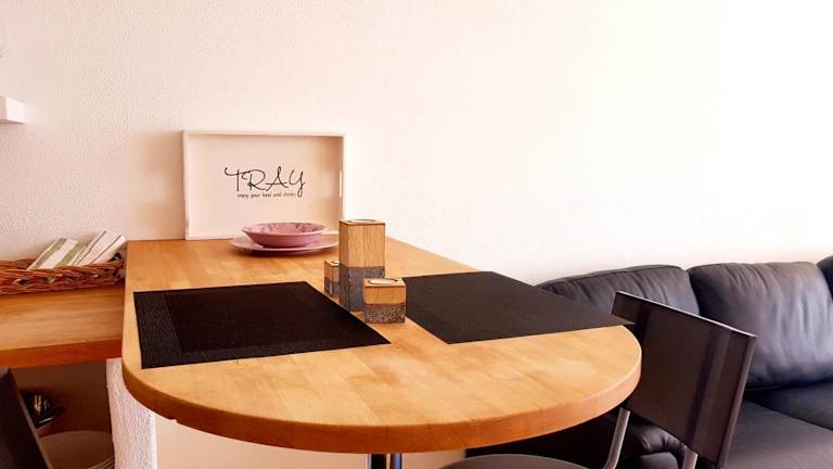 Eine voll ausgestattete Küche steht den Gästen zur Verfügung, in der sie ihre eigenen Mahlzeiten zubereiten können. Lebensmittellieferung ist ebenfalls verfügbar. Es gibt die Möglichkeit, im Freien zu speisen, insbesondere auf der Terrasse mit Stadtblick.