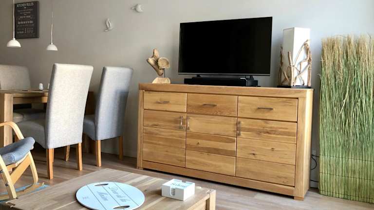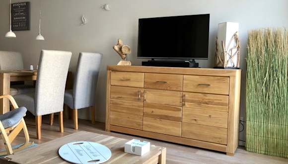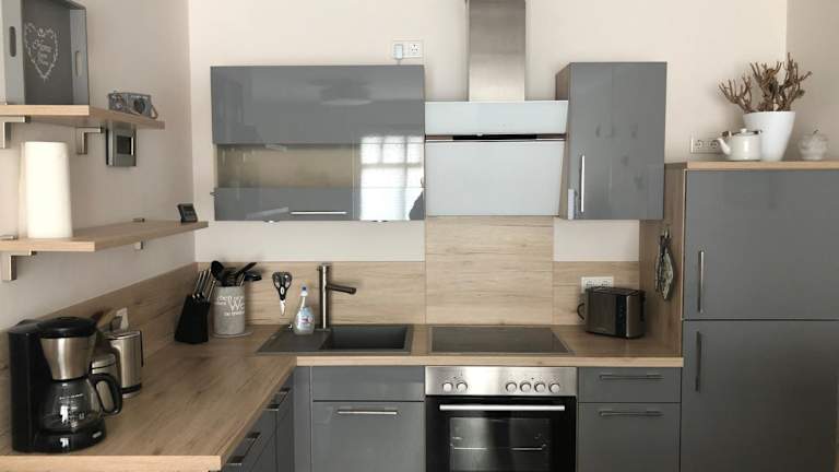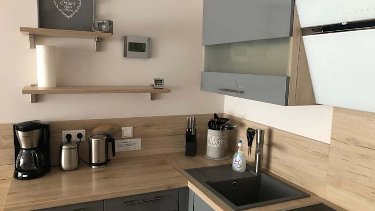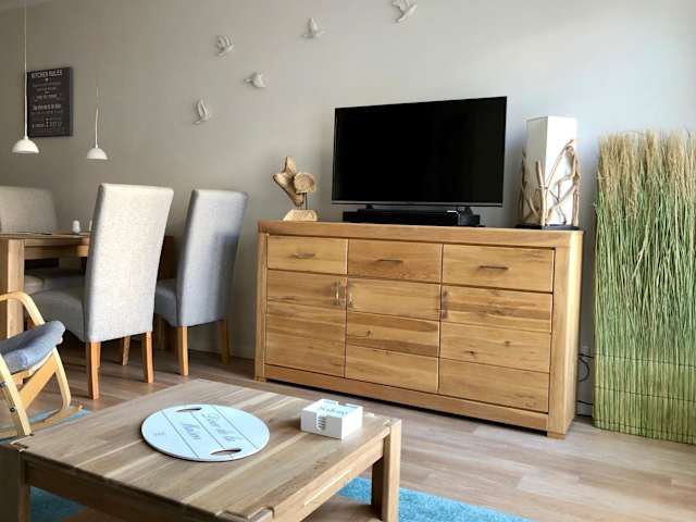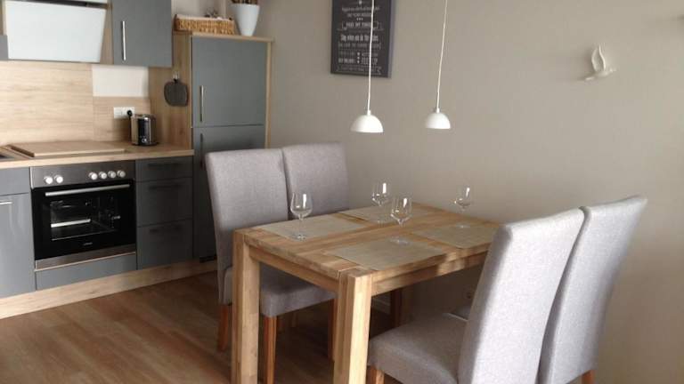 Die Ferienwohnung bietet eine gut ausgestattete Küchenzeile mit Kühlschrank, Geschirrspüler und Ofen. Zudem umfasst sie ein Wohnzimmer mit Essbereich, ein Schlafzimmer und ein Badezimmer mit Dusche. Für zusätzlichen Komfort können Handtücher und Bettwäsche gegen Aufpreis bereitgestellt werden.