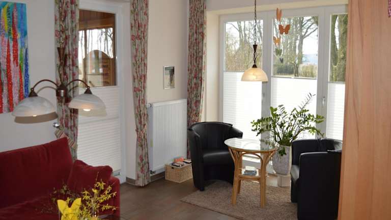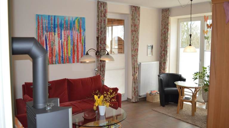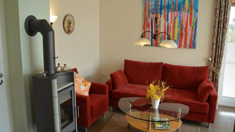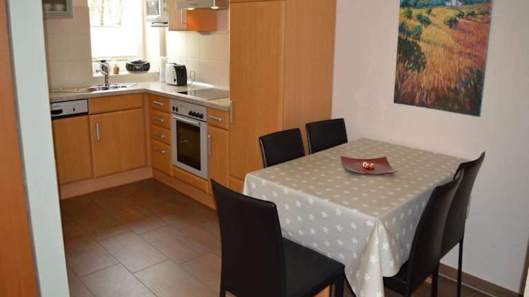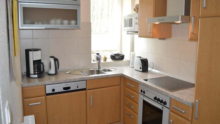 Das Ferienhaus umfasst zwei Schlafzimmer, ein Wohnzimmer mit TV, eine gut ausgestattete Küche mit Kühlschrank und Geschirrspüler sowie ein Badezimmer mit Dusche. Handtücher und Bettwäsche werden bereitgestellt.