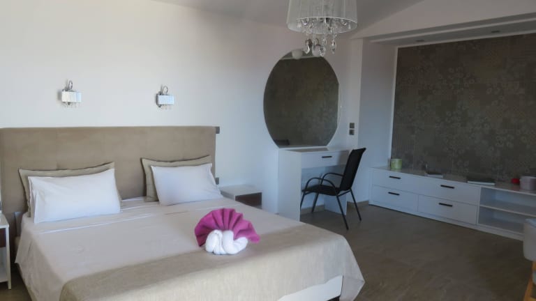 Die klimatisierten Zimmer sind in hellen Farben gehalten und verfügen über einen möblierten Balkon mit Blick auf die Ägäis, Sat-TV und einen Kühlschrank. Jedes Zimmer bietet zudem einen Haartrockner und ist auf die Bequemlichkeit der Gäste ausgerichtet.