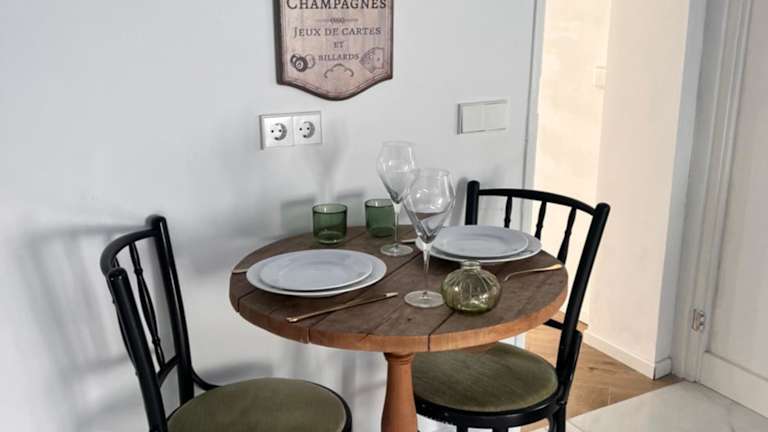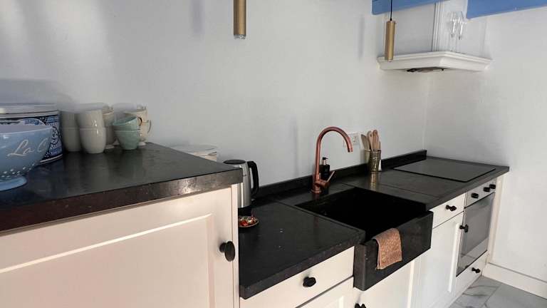 Die komplett ausgestattete Küche inklusive Kühlschrank, Ofen, Herdplatte sowie Kaffeemaschine und Wasserkocher ermöglicht es den Gästen, ihre eigenen Mahlzeiten zuzubereiten. Keine weiteren Verpflegungsmöglichkeiten oder Dienstleistungen sind beschrieben.