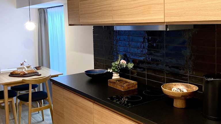 Die Zimmer sind mit Klimaanlage, einer voll ausgestatteten Küchenzeile mit Essbereich, einem Flachbild-TV und einem eigenen Badezimmer ausgestattet. Zusätzlich gibt es einen Kühlschrank, einen Geschirrspüler, eine Mikrowelle, eine Kaffeemaschine sowie einen Wasserkocher. Bademäntel und Haartrockner sind ebenfalls vorhanden.