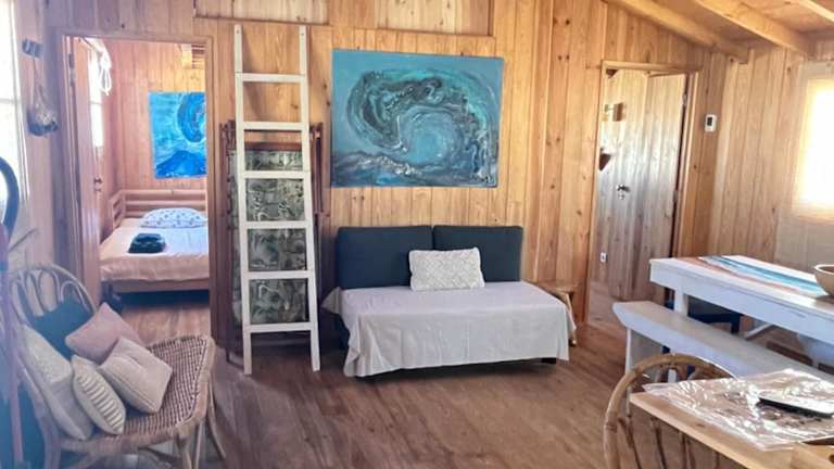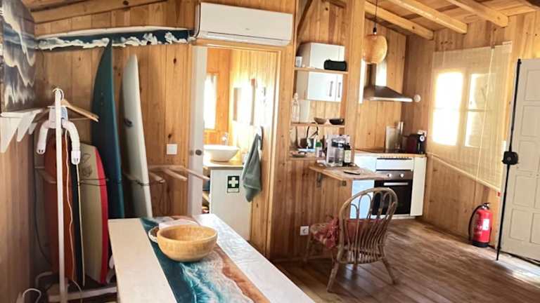 Die Costa da Caparica Beach Hut - Surf and Relax ist ein Chalet, das über einen Balkon verfügt und mit einer gut ausgestatteten Küchenzeile, einem Wohnzimmer sowie zwei Schlafzimmern ausgestattet ist. Handtücher und Bettwäsche werden bereitgestellt. Die Unterkunft bietet außerdem eine Sonnenterrasse.