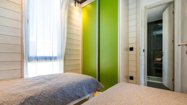 Die mobilen Heime bieten einen Balkon, einen Sitzbereich und sind ausgestattet mit einem Satelliten Flachbild-TV. Zudem verfügen sie über eine voll ausgestattete Küche mit Kühlschrank, Geschirrspüler, Herdplatte, Kaffeemaschine und Wasserkocher. Ein eigenes Badezimmer mit Dusche und Haartrockner sorgt für weitere Bequemlichkeit.