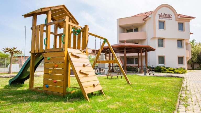 Das Liza Apartmanok bietet gemütliche Wohneinheiten mit einer Vielzahl an Annehmlichkeiten. Zu den Einrichtungen zählen kostenfreies WLAN, eine Klimaanlage sowie ein gemeinschaftlicher Garten und eine Terrasse. Die Unterkunft ist speziell für Familien geeignet und ermöglicht eine entspannte Atmosphäre.