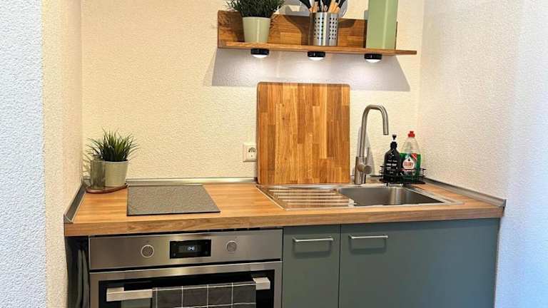Die Ferienwohnung beinhaltet 1 Schlafzimmer, eine gut ausgestattete Küche mit Kühlschrank und Ofen, einen Flachbild-TV sowie einen Sitzbereich. Das Badezimmer ist mit einer Dusche ausgestattet, und es werden Handtücher sowie Bettwäsche bereitgestellt.