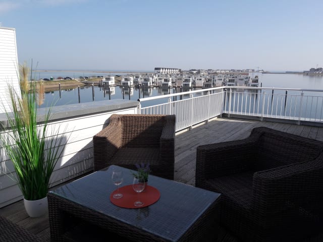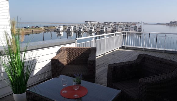 Zum kleinen Strand direkt im OstseeResort sind es 1500 m, zum öffentlichen Weidefelder Strand südlich des Resorts ca. 3 km, und zur (zukünftigen) Hafenpromenade mit Geschäften, Cafés, Restaurants und Supermarkt nur 300 m – hier ist dann "Hafenfeeling live" angesagt. Der Clou dieses ausgefallenen Ferienobjekts ist aber ganz einwandfrei der spektakuläre Ausblick, der mit Sicherheit zu den schönsten im ganzen Ferienresort gehört!