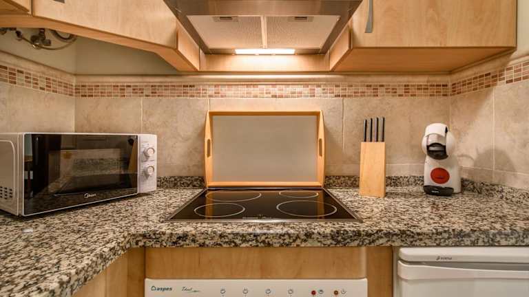 Die Ferienwohnung umfasst eine voll ausgestattete Küche, ideal für Selbstversorger. In der Küche sind ein Kühlschrank und eine Kaffeemaschine vorhanden. Gäste können zudem bei einem Zvieri auf der Terrasse entspannen.