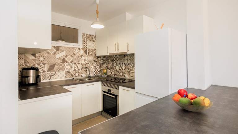 Die Unterkunft bietet zwei helle Schlafzimmer, ein Badezimmer und eine komplett ausgestattete Küche. Die Zimmer sind mit Bettwäsche und Handtüchern versehen und verfügen über einen Flachbild-TV. Zudem können die Gäste die Terrasse mit Stadtblick nutzen.